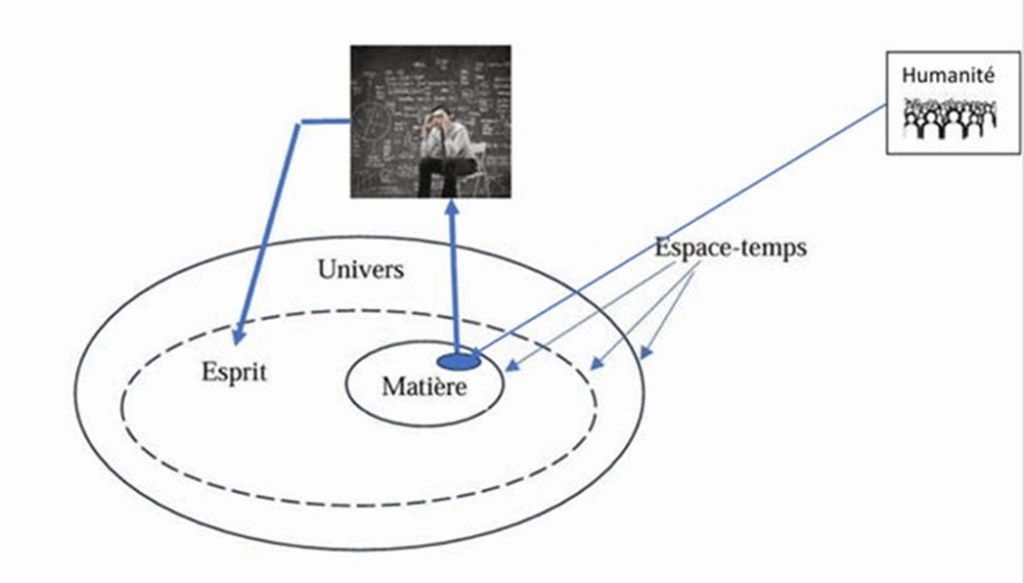 Sur le constat que notre existence ne peut que se constater et que l’espace-temps représentant l’univers n’a également besoin de rien d’autre que lui pour exister et qu’on ne peut que constater son existence, on déduit qu’il y a un morphisme entre les deux entités.